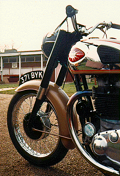 "Artistic" shot of my 1961 Golden Flash, taken by my wife. She's well proud of the photo, so am I. Taken at British Motorcycle Society Rally on the Isle of Wight 1989. Scan by richardw@spider.co.uk (Richard Whitehead).