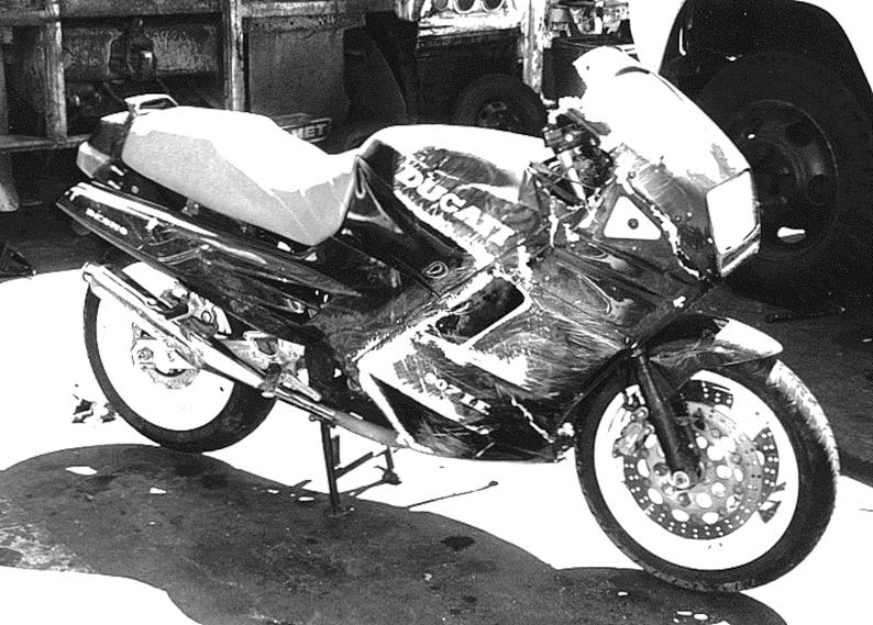 A couple of folks have expressed interest in what my poor Ducati 907IE looks like after having a deer hop into it at 40 mph, sliding along for 100 ft and then dropping into a culvert. 907-TOAST.JPG is a picture taken by Tom Dietrich at the storage yard shortly after the incident and shows the nasty side. Godfrey DiGiorgi - ramarren@apple.com - 12 July 1994