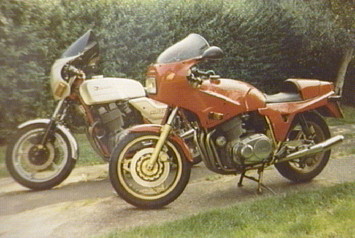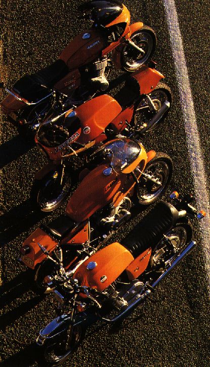 Four legends in one picture. All looking like tasty oranges. From top to bottom: Jota, racekitted SFC, original SFC, 750SF Scan by Niclas Cederlund <epknice@kaepk4.ericsson.se>.