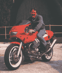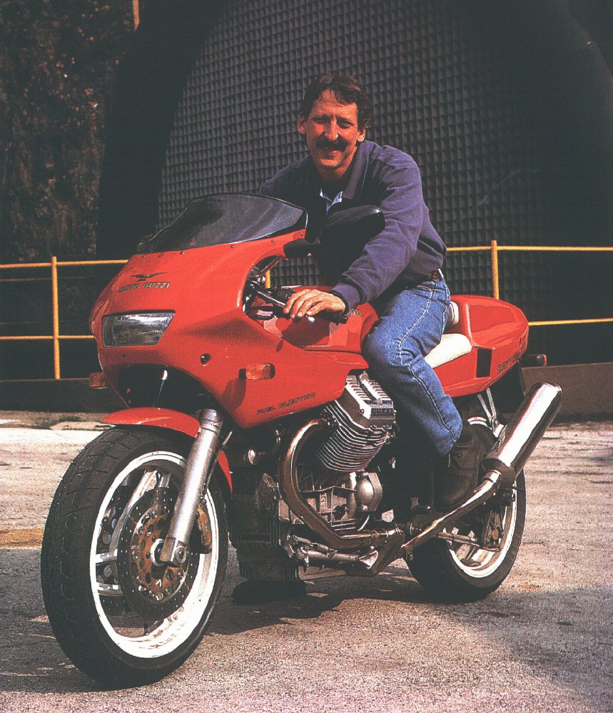 Dr. John Wittner of Philadelphia, PA, posing on a Moto Guzzi Daytona 1000 at the factory in Mandello del Lario, Italy. He was the driving force behind the development and eventual mass production of the Daytona 1000.