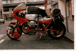 I snapped this shot in Inverness, Scotland and was lucky enough to talk to the bike's owner, a Dutch guy on tour with his girlfriend (who had her own very nice white Lario with a Le Mans I fairing). Though amazingly modified (big bore engine, floating rear break, oversized wheels, dropped battery box, EPA pipe, even a very trick shifter that comes straight off the tranny) what I found really stunning was that he made the molds for the fairing and seat section and did all the engine work himself!