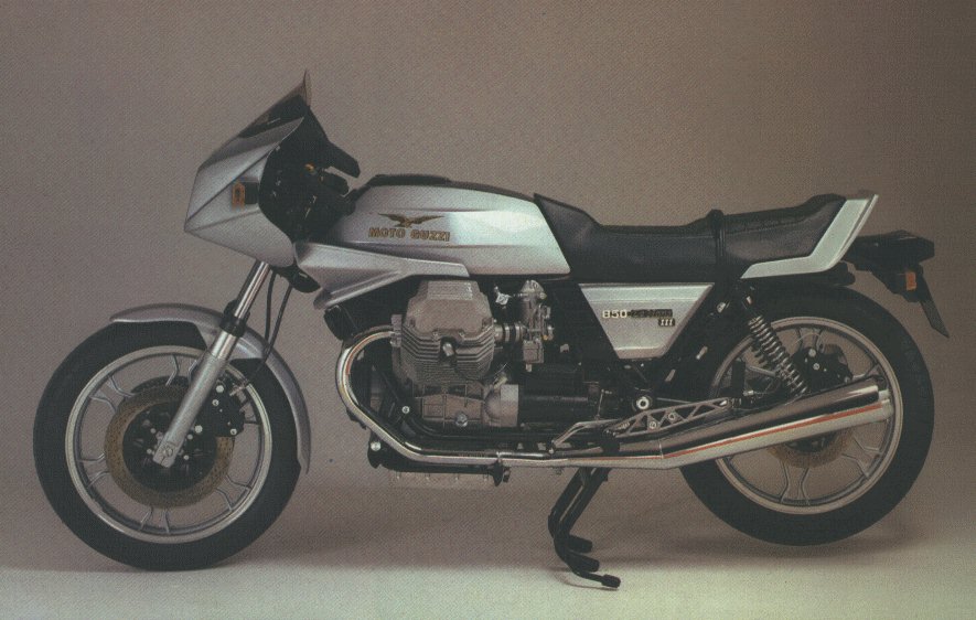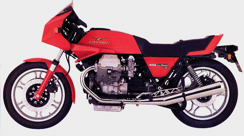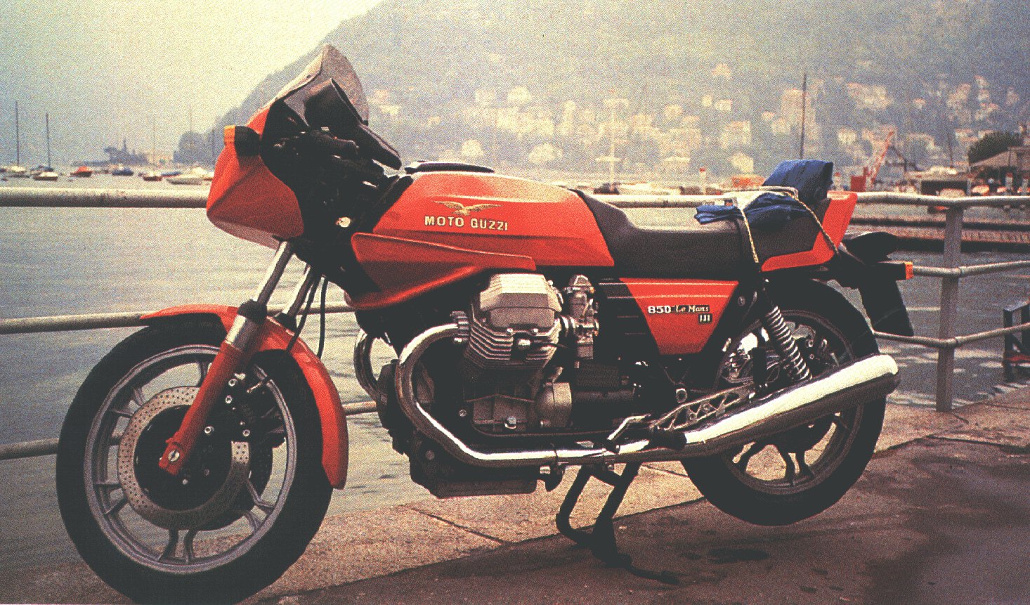 A Moto Guzzi 850 LeMans III sitting on the quai with the Lago di Como in the background.