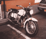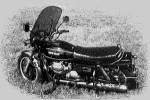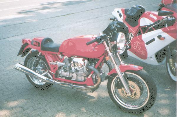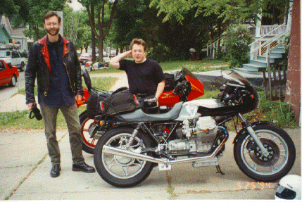 Marc Alley (leather jacket) and William Kuskin (scratching his head) just before heading west for the '94 National MGNOC rally in West Virginia. Front and center is Marc's extremely revamped '84 Le Mans. Marc has added a Sprint fairing, gammon seat, aluminum tank by The Tank Shop, Bub Contis, and battery beneath the transmission. William's LM IV peeks out from behind.