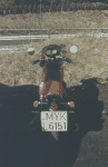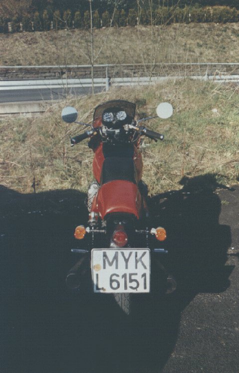 A rear view of a Moto Guzzi V 50 Monza outside the "Cafe Fahrtwind" in Ahrweiler-Ahrbrueck, Germany. Photo and scan by Markolf Gudjons <markolf@lfbs.rwth-aachen.de>.