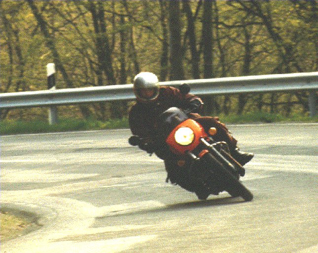 Guus (Guz) Duijvestijn's <guus@psi.ch> high-mileage Moto Guzzi V50, almost dragging a peg.