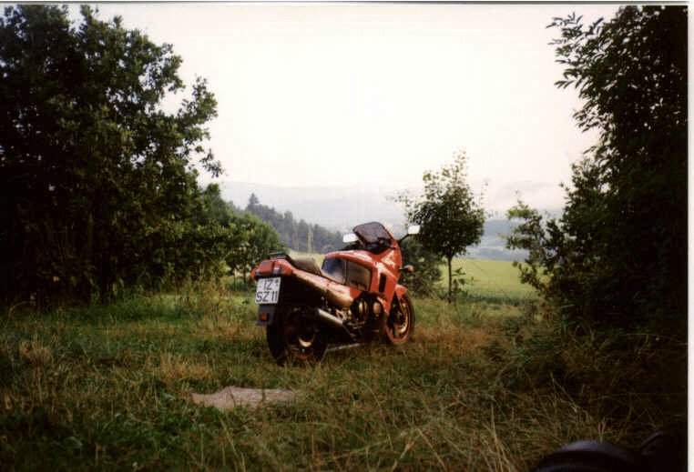 It's steaming hot as we're standing on a hillside taking in the view across the valley. In a summer as hot as that of '94, you try to get as high up the mountains as you can; especially around lunchtime. And that leather gear certainly doesn't help...