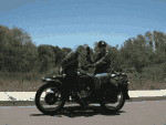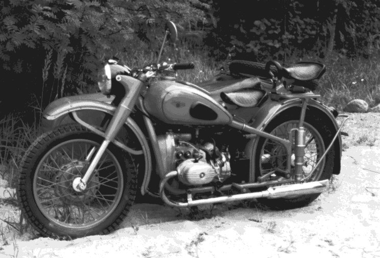 1960 IRBIT M-61 and sidecar 650cc 28hp@4600rpm 380kg total weight (840# for the metric impaired) 70 km/hr cruising speed (44mph for the metric impaired) Made in Irbit motorcycle factory in Irbit, then USSR. Color scheme is dark tan body and wheels with red pinstriping. (Not original paint!) The bike belongs to a friend of Keijo Virtan (kvirtane@tukki.jyu.fi) Scanned by David Stivers (stiv@stat.rice.edu)