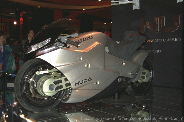 Nuda02.jpg 98993 Short: 768x512 24bit JPEG: Suzuki Nuda concept bike, '86 Bike Show. Long: Excellent quality Photo CD base image, right side of the Nuda (hub centre steering, two-wheel drive, orgasmic styling) 4xBase (1536x1024) and 16xBase (3072x2048) images available on request. (adam@ifeng.demon.co.uk, adam@isysg.com)
