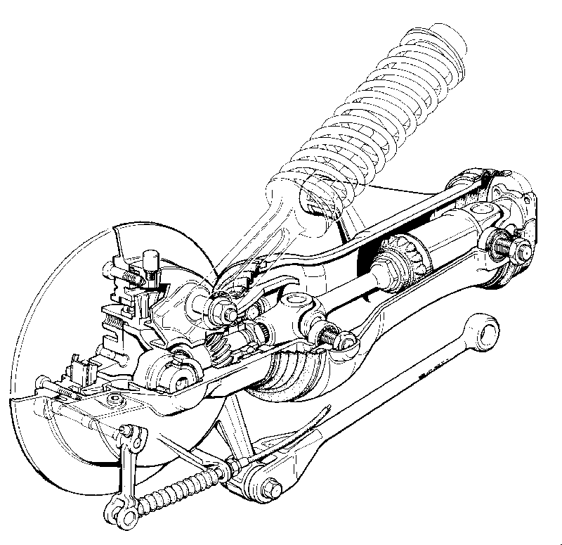 Like the monolever, the mono suspension flexible arm contains the drive shaft, but this one is dry (a source of problems). The rear wheel is fixed by 4 lug bolts in place of the previous 3 lug nuts and the final drive pivots against the swingarm to reduce its rotation as the suspension moves