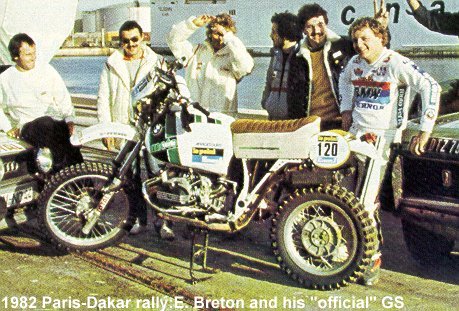 Official Team: BMW France Sponsors: Le Point, Wilkinson Colors: White. Pilotes: 100. Hubert Auriol - F 101. Fenouil - F 102. R. Loiseaux - F 120. E. Breton - F (Team Moto-Verte) Bikes technical data: Bikes prepared in France by Arcueil Motor 55hp, 980cc engine, 150kg Monolever rear suspension, fork Maico Engine protection bars on white frame Results: All the team out at Gao (10 January), general gear box default! Trivia: Eric Breton was journalist at Moto-Verte (French dirt bikes journal) and was riding an official bike as "pilote- journalist" |