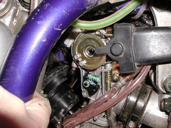The screw has some pinkish stuff on the threads, and is shown partially removed near the center of the above picture, just below and slightly to the left of the throttle cable ends in the circular gizmo.