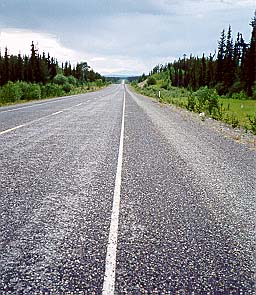 About 20 miles from Watson Lake I hit the real crud. A 10 mile stretch of road construction. It's the weekend so very few people are working on it. The stuff is wet from the rain and the mud that formed in the part of the road that one would drive on has the consistency of snot. The edge of the road is very deep gravel. Not an option on the Futura. The muddy center has so many potholes that are arranged in such a random fashion that there is no way to avoid them. This is 5 to 10 mph for 10 miles. I almost dump the bike twice. Once in the snot, once when I probed the deep gravel for a better way through. I hope this is fixed by the time I come back through.