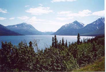 A little over an hour out of Rancheria, the road has already dipped back into BC, which it does for about a 50 mile stretch. I'd passed McNaughton Lake and I'm thinking, boy this is a long leg. I decide to stop and have some of those fine foil packaged dry roasted peanuts (which I'm still working on as I write this), a little water and rest my buns awhile. I'm standing on the side of the road and a Raven flies over. I look back down the road the way I came. I look up the road the way I'm heading. I realize that 50-75 miles in either direction there is nothing but trees, animals and pavement. No services of any kind, no homesteads, no wilderness lodges, nothing, nadda. That feeling of being remote hits me again and I begin to question my sanity. I start to think about how far I've come and what a long ride home it's going to be. I start to wonder how many brown (grizzly) bears there are in the area and how long it would take them to discover me as their next meal. At the same time providing a meal for that Raven that just flew over and is now squawking in a tree just up the road. I was raised in a woodsy hunting/camping kind of family. My great grandfather surveyed much of northeastern Washington in the early part of the century and his sons were miners in some pretty remote areas from the 30's up until the 50's. What I'm trying to say is that I'm comfortable in the woods most of the time, but I could swear the Raven was broadcasting the word "Food" over and over again.
